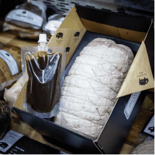A hamper with all you need for your Roast Pork rack, except the vegetables!