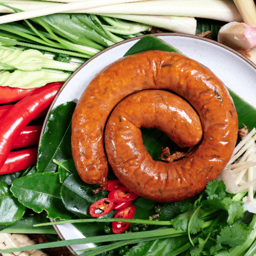 Sai oua, or Northern Thai sausage, is a spicy, smoked pork sausage from the Chiang Mai region of Thailand, with its rich blend of herbs, spices, and chili its perfect grilled over coals, or even just simply fried off in an airfryer.